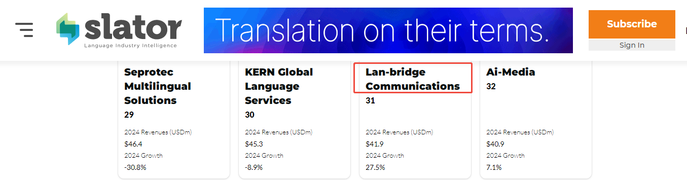 根據(jù)四川日報報道,語言橋已成功入選國家語言服務(wù)出口基地。根據(jù)CSA國際權(quán)威排行,語言橋已連續(xù)多年入選 CSA Global Top 50 語言服務(wù)供應(yīng)商。2025年,在國際權(quán)威第三方機構(gòu)——Slator發(fā)布的"The Slator 2025 Language Service Provider Index"(2025年語言服務(wù)提供商指數(shù))中語言橋位列全球翻譯服務(wù)提供商第31位。與此同時,語言橋已榮獲ISO9001:2015質(zhì)量管理體系認證、國家高新技術(shù)企業(yè)、翻譯協(xié)會會員、AAAAA級筆譯服務(wù)認證、AAAAA級口譯服務(wù)認證、亞太地區(qū)語言服務(wù)提供商TOP10、全國優(yōu)秀翻譯服務(wù)企業(yè)等多項殊榮。